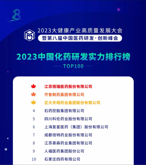 由药智网、中国药业杂志社主办的2023大健康产业高质量发展大会暨第八届中国医药研发•创新峰会于6月16日开幕,会上发布了《2023中国药品研发实力排行榜》系列榜单,AG百家乐医药凭借深厚的创新研发实力再创辉煌:荣登《2023中国药品研发综合实力排行榜TOP100》榜首、《2023中国化药研发实力排行榜TOP100》榜首。值得一提的是,今年是AG百家乐医药连续第6年入选《中国药品研发综合实力排行榜》榜首。